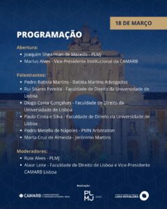 No dia 18 de março, das 16h30 às 18h30, acontecerá o debate sobre “O Futuro da Arbitragem: Eficiência, Inovação e os Desafios da Atualidade”, no PLMJ Advogados, na Avenida Fontes Pereira de Melo, 43, Lisboa, Portugal. O evento é uma correalização da CAMARB, PLMJ Advogados e CCILB – Câmara de Comércio e indústria Luso-Brasileira.