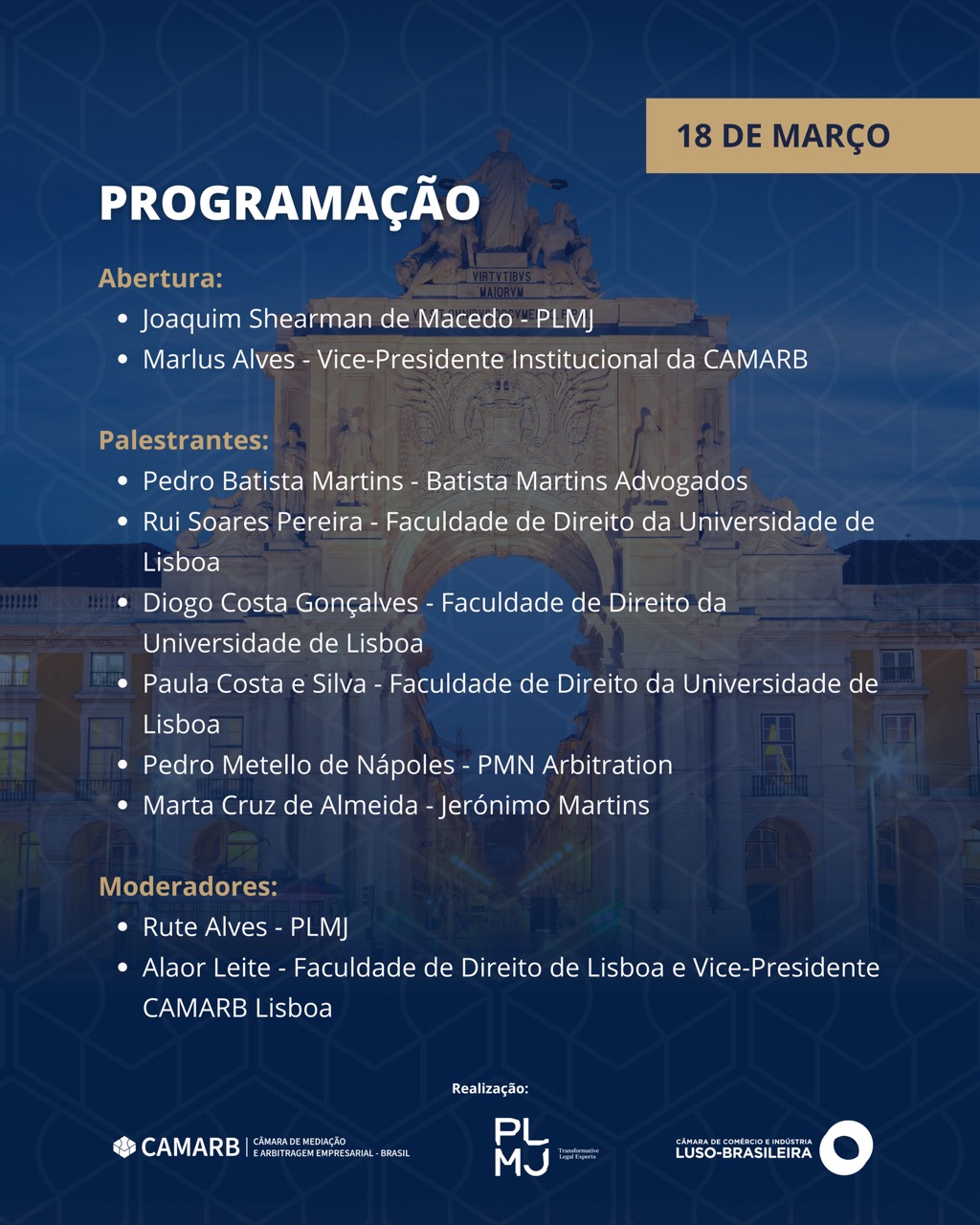 Na ocasião, Marlus Alves, Vice-Presidente Institucional da CAMARB, estará presente no painel de abertura do evento, Pedro Batista Martins, membro do Conselho Deliberativo da CAMARB, participará como palestrante, sob a moderação de Alaor Leite, Vice-Presidente CAMARB Lisboa.