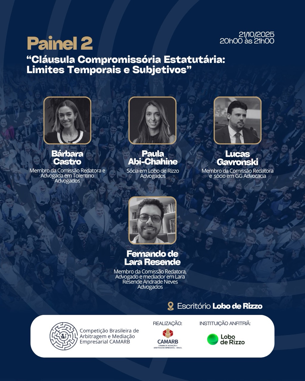 O segundo painel discutirá a temática “Cláusula Compromissória Estatutária: Limites Temporais e Subjetivos”, com a participação de Bárbara Castro, Paula Abi-Chahine, Lucas Gavronski e Fernando Lara Resende.
