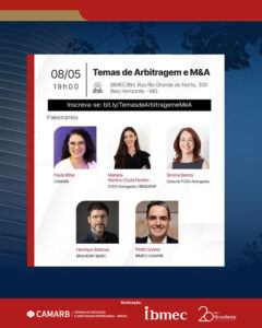 No dia 8 de maio, em Belo Horizonte, a partir das 19h, acontecerá o Evento “Temas de Arbitragem e M&A”, uma correalização da CAMARB, IBMEC e IBRADEMP.