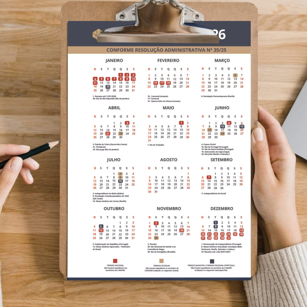 A CAMARB publica, nesta página, o Calendário 2026 em PDF, com as datas previstas na Resolução Administrativa nº 35/2025. O calendário detalha os feriados e pontos facultativos que impactam os prazos nos procedimentos de arbitragem, dispute board e mediação.